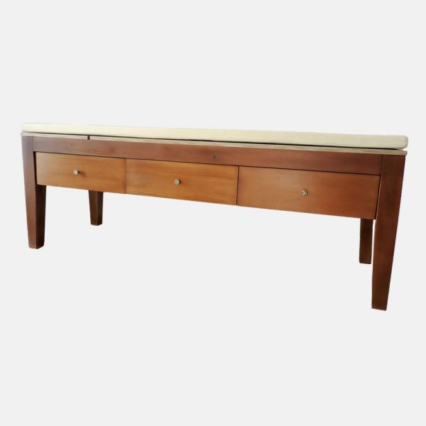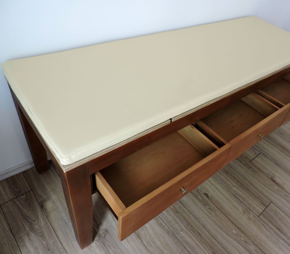 Dispune de trei sertare adânci pentru depozitarea materialelor necesare, iar sertarul din stânga are un blat prevăzut cu balamale, care mascheaza interiorul sertarului şi serveşte drept măsuţă pentru dispozitive de masaj, laptop, imprimantă. Blatul este secţionat, cu partea superioară rabatabilă.
